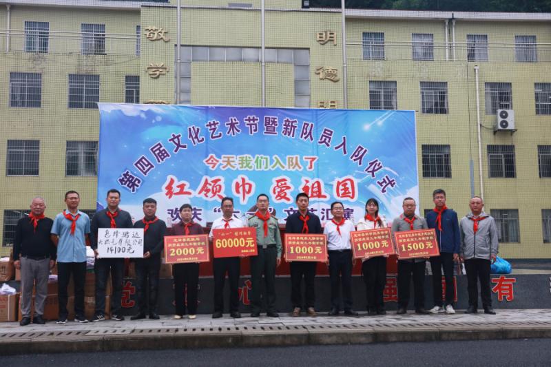 在鹿窝镇九年义务制学校,该校的少先队员们为前来参加活动的军地领导佩戴红领巾。捐赠仪式上,各单位向鹿窝镇九年义务制学校捐赠爱国主义教育图书100余册、并送上学习和体育用品等,同时向全体学生表达节日祝福。捐赠仪式结束后,官兵们观看该校学生少先队员入队仪式和文艺汇演。