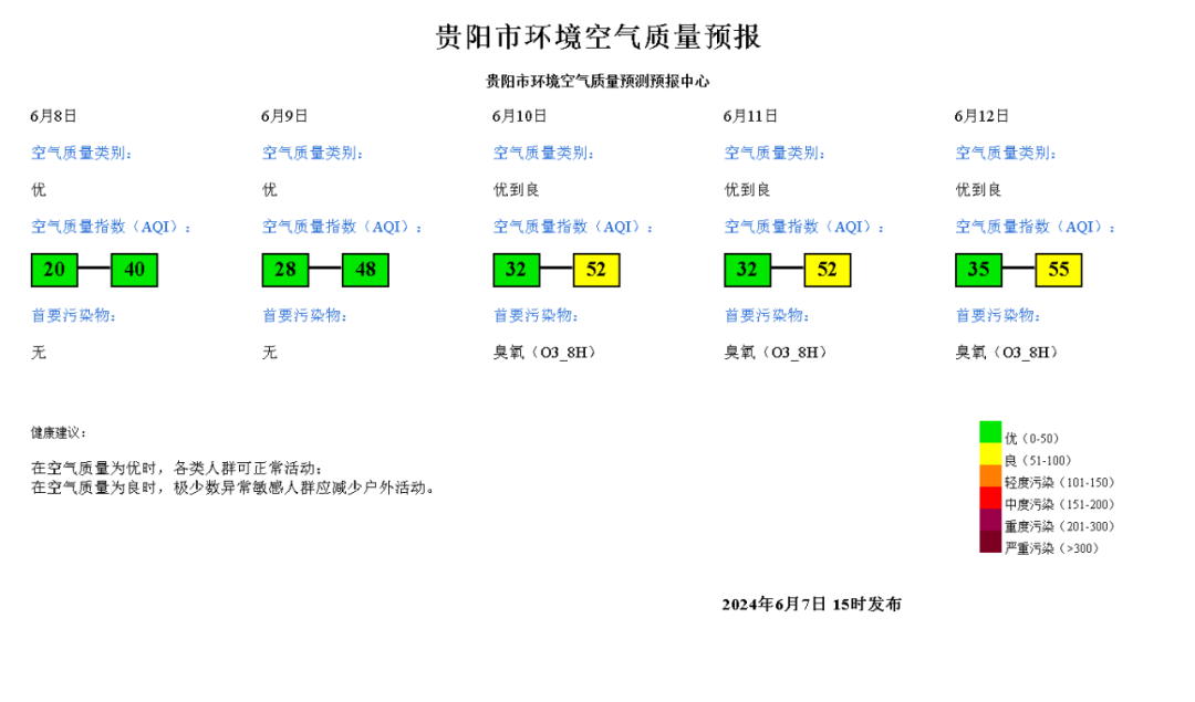 预计贵阳市范围2024年6月8日空气质量指数(AQI)范围:20~40;空气质量类别:优。