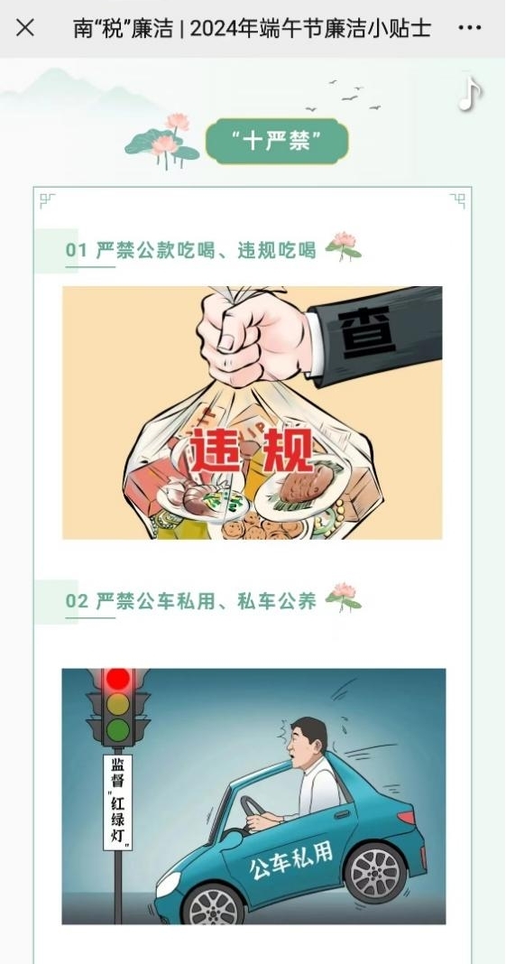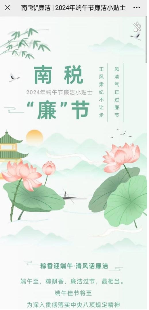 为营造风清气正的节日氛围,端午节前,南明区税务局以H5的形式制作发布了2024年端午“廉洁小贴士”,开展节前廉政提醒,引导干部职工严守节日“廉洁关”。