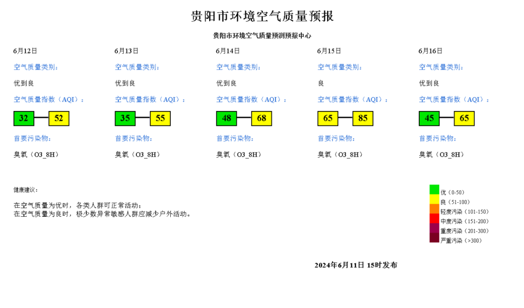 6月15日空气质量指数(AQI)范围:65~85;空气质量类别:良;首要污染物:臭氧(O3_8H)。