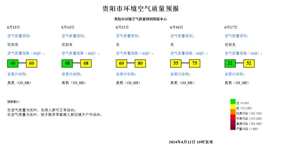预计贵阳市范围2024年6月13日空气质量指数(AQI)范围:40~60;空气质量类别:优到良;首要污染物:臭氧(O3_8H)。