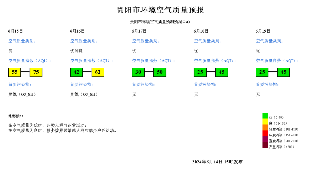 预计贵阳市范围2024年6月15日空气质量指数(AQI)范围:55~75;空气质量类别:良;首要污染物:臭氧(O3_8H)。
