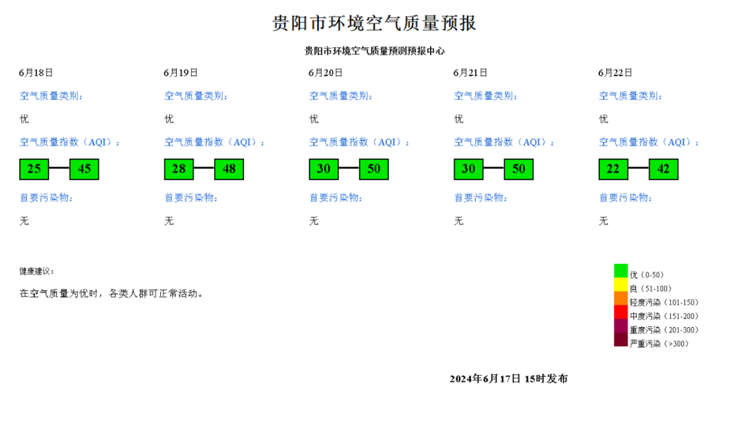 预计贵阳市范围2024年6月18日空气质量指数(AQI)范围:25~45;空气质量类别:优。