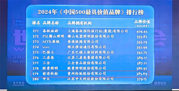 6月19日,由世界品牌实验室(World Brand Lab))、世界经理人主办的第21届世界品牌大会在北京举行。大会发布了2024年《中国500最具价值品牌》分析报告,贵州轮胎股份有限公司(以下简称“贵州轮胎”)前进品牌以价值385.69亿元人民币,位列2024年中国500最具价值品牌279名,比2023年增加72.74亿元,上升18名。