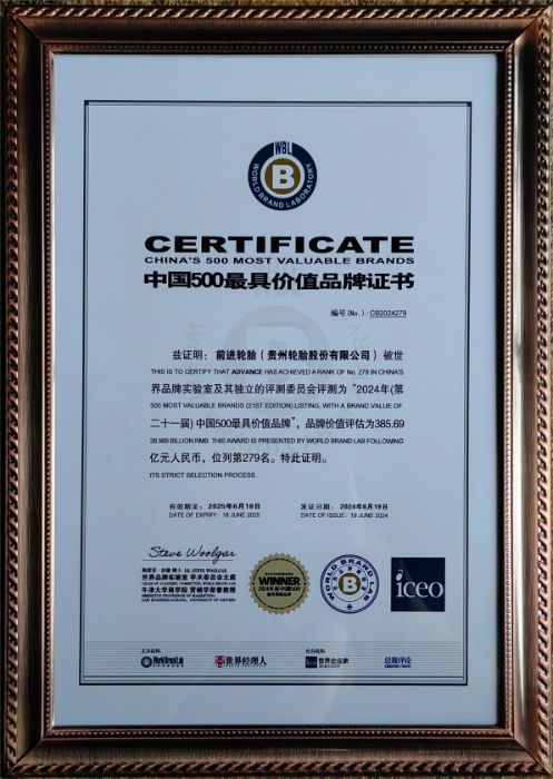 世界品牌实验室(World Brand Lab)是一家国际化的品牌价值研究机构,全资附属于世界领先的数字技术和战略咨询公司,其研究成果已经成为许多企业并购过程中无形资产评估的重要依据。已连续二十一年发布的《中国500最具价值品牌》,采用“收益现值法”对品牌价值进行测评。在这份基于财务数据、品牌强度和消费者行为分析的年度报告中,贵州轮胎前进品牌凭借核心科技产品增强市场营销影响力、数字渠道建设、强化新媒体数字营销宣传、数字化品牌建设,位列2024年榜单279名。