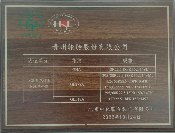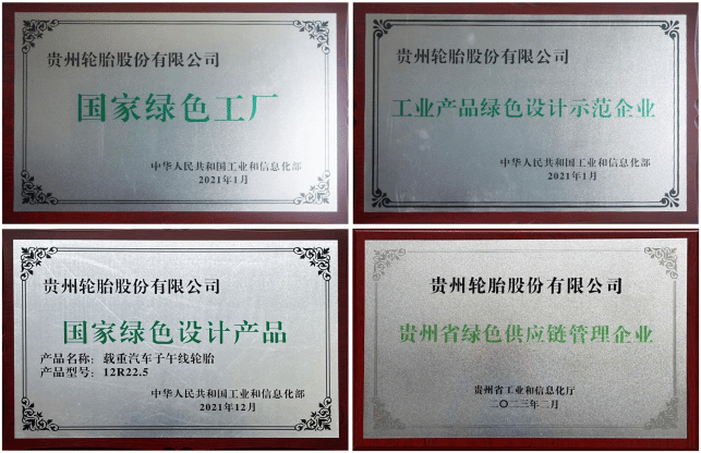 此外,在2021年,贵州轮胎被工业和信息化部评为“国家绿色工厂”“工业产品绿色设计示范企业”和“国家绿色设计产品”;2022年10月,GHA/GL278A/GL518A 花纹系列产品获得全国首批“中国绿色产品认证证书”;2022年6月获评贵州省重点用能单位“百千万”优秀行动优秀企业;2023年获评贵州省工业和信息化厅“贵州省绿色供应链管理企业”、贵州省生态环境厅“贵州省 2023 年积极购碳企业”和中国石油和化学工业联合会“2022年度能效领跑者标杆企业(轮胎)”。这些成果的取得,标志着贵州轮胎在履行企业社会责任、推动可持续发展方面走在行业前列,“绿色高质量发展”已经成为贵州轮胎发展的鲜明底色。