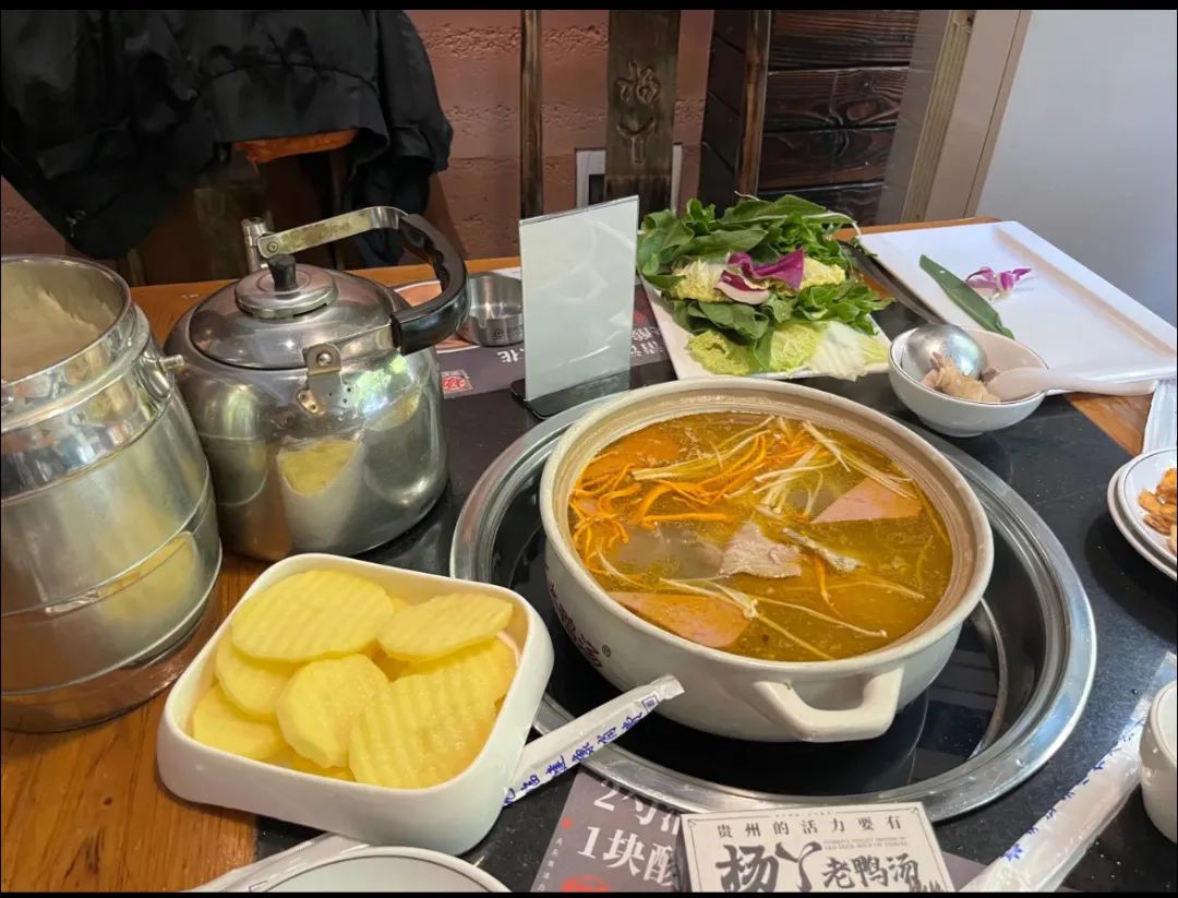 他家是贵阳非常经典的老鸭汤,锅底是软烂脱骨的一整只鸭,汤底鲜香浓郁,配上萝卜和竹荪,美味又养生。