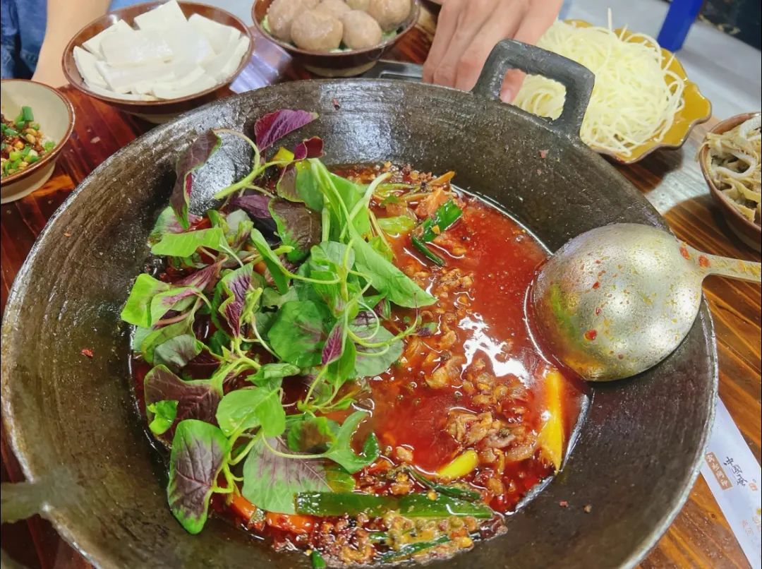 地摊火锅主打一个“新鲜便捷”,现炒的锅底、现切的五花肉打底爆炒出油,再下豆豉、豆瓣等各种酱料调料,煮上肥瘦相间的肉片、新鲜的蔬菜,浓郁的汤底越煮越香,超接地气超有味道!