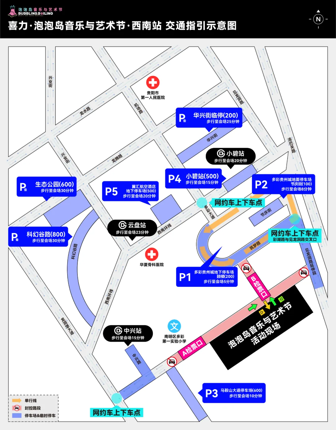 ① 中兴路方向,到达云盘站A1口,距离场地约1.7公里,步行23分钟到达音乐节现场;