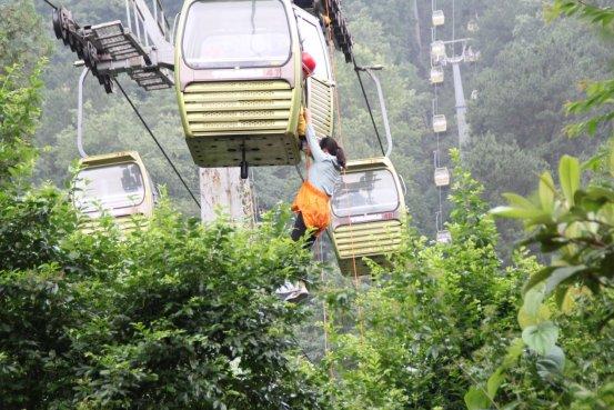 在黔灵山公园,演练模拟索道设备突发故障停运,索道轿厢内有2名游客被困,索道运营管理方立即启动救援预案,救援人员第一时间赶赴游客被困点下方,安抚游客情绪。另一组救援人员爬上铁塔支架,运用救援工具到达“被困游客”的吊厢,再通过缓降器和地面救援人员的配合,最终将被困游客安全救助到地面,救援过程平稳有序,成功解救被困游客。
