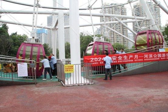 在河滨公园,演练模拟摩天轮设备突发停电,多名游客被困轿厢内。事发后河滨公园管理方立即召集人员集合,启动应急救援预案开展救援,同时通过轿厢内广播安抚被困群众。救援人员通过释放驱动轮气压,利用人力推动轿厢,逐个将轿厢推至地面打开舱门解救被困游客,最终所有被困游客全部顺利解救。
