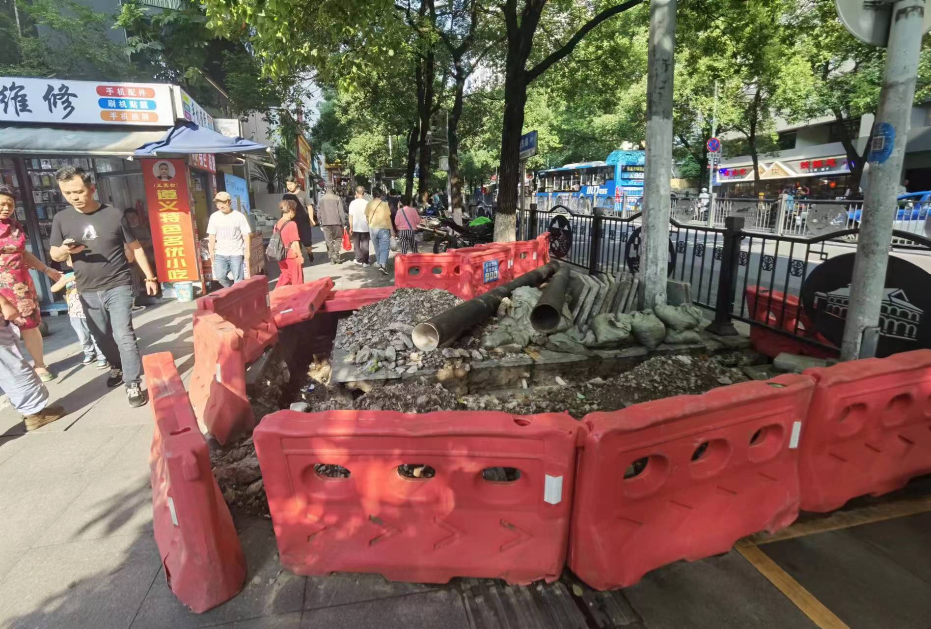 周边一商铺店员岑先生告诉记者,他记得占道施工是6月16日开始的,但当天开挖后,便没有再继续施工。“这里属于市中心,长期占道不仅给市民出行添堵,也影响市容。”岑先生希望施工方能尽早完工,保障市民出行畅通。