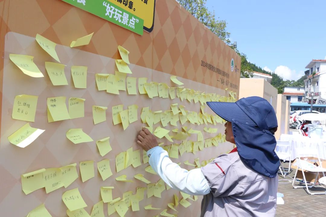 现场一位市民拿起笔,在地图上仔细寻找着自己心目中的最佳景点,然后认真地在便利贴上写下:青岩古镇,超好玩。旁边的一位市民则推荐了:甲秀楼,历史的传承。随后,他们将其粘贴在“我”来推介的展板上。