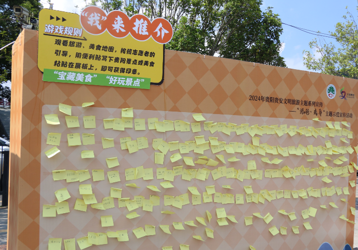 除了景点,美食也是推介环节的重头戏。一位品尝过贵阳特色小吃的来筑旅客在便利贴上写下:恋爱豆腐果。“我觉得豆腐炸得酥脆里嫩,配上折耳根辣椒蘸水,美味极了,咬一口就能感受到满满的幸福感。”推荐旅客表示。另一位来筑旅客则推荐:丝娃娃。“听说丝娃娃是贵阳人最爱的小吃,我来了之后第一时间打卡,各种蔬菜包裹面皮里,再蘸上特制的酸汤,特别推荐!”