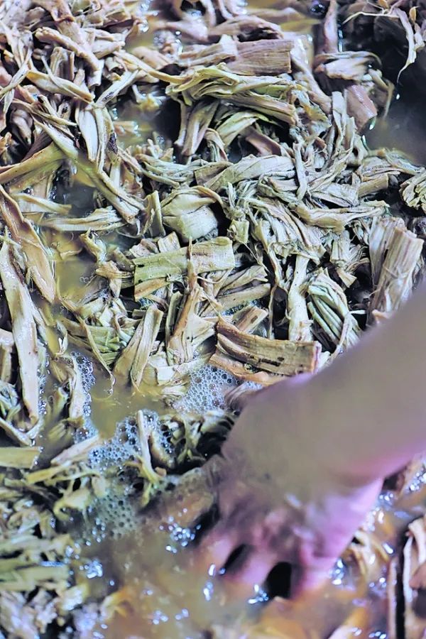 ▲在窖窑里发酵半月后,构皮纸浆才能放进抄纸水槽抄做纸张。