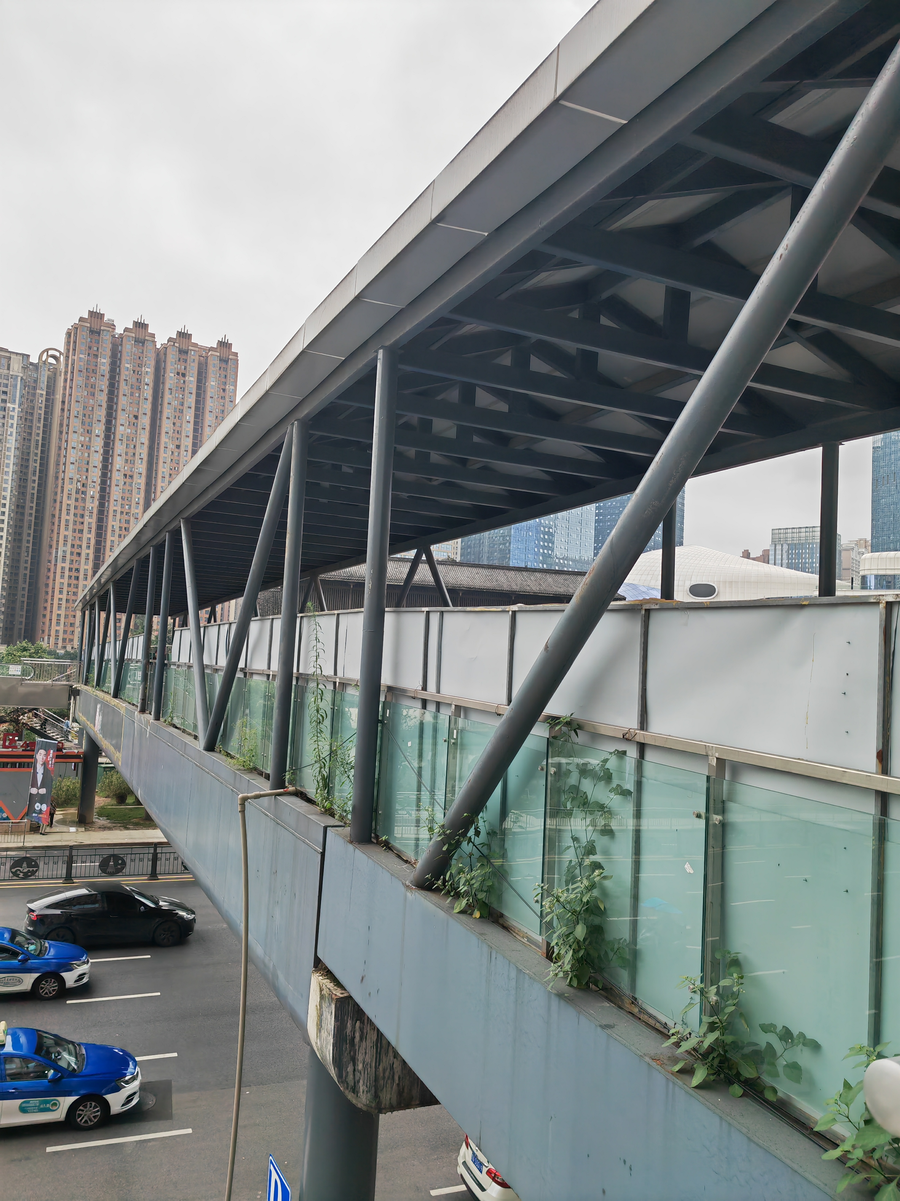 市民反映的过街天桥位于贵阳轨道交通三号线花果园站B出口上方。6月24日,记者现场看到,该天桥长约15米,除上下楼梯口外,两侧均立有铁质围挡,这些围挡高约1.6米,高出天桥两边原有玻璃围栏。现场没有施工迹象,行人可正常通行。