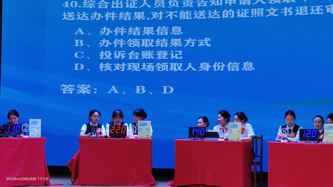 本次大赛分为个人赛和团体赛,竞赛内容围绕法律法规业务知识、系统操作、电脑操作的掌握应用情况,以及服务规范、仪容仪表、应急处置等方面的综合素质进行考察,涵盖政务服务标准、数字化改革、营商环境优化提升、政务服务礼仪、政务服务平台应用等内容。