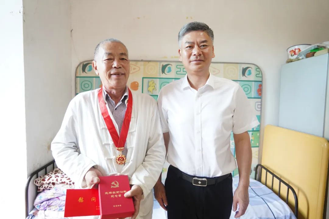 每到一处,许俊松都与老党员促膝交谈,感谢他们为党和国家事业作出的贡献,关切询问身体和家庭情况,送去慰问品和慰问金,并为老党员王光荣、曾庆运颁发“光荣在党50年”纪念章,勉励他们在保重身体的同时坚持离岗不离心、退休不褪色,坚持和发扬党的优良传统,积极发挥先锋模范作用,一如既往关心支持经开花溪经济社会发展。