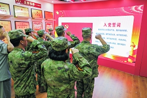 7月1日,花溪区人武部组织全体党员开展主题党日活动,并重温入党誓词。图为花溪区人武部党员面对党旗庄严宣誓。
