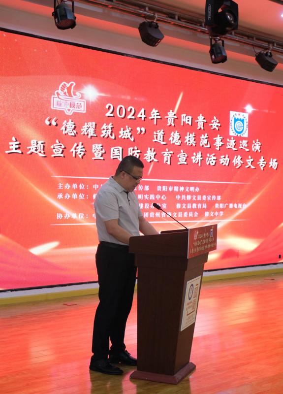 7月1日,由中共贵阳市委宣传部、贵阳市精神文明办主办、贵阳广播电视台承办的2024贵阳贵安“德耀筑城”道德模范事迹巡演主题宣传暨国防教育宣讲活动在修文中学举行。