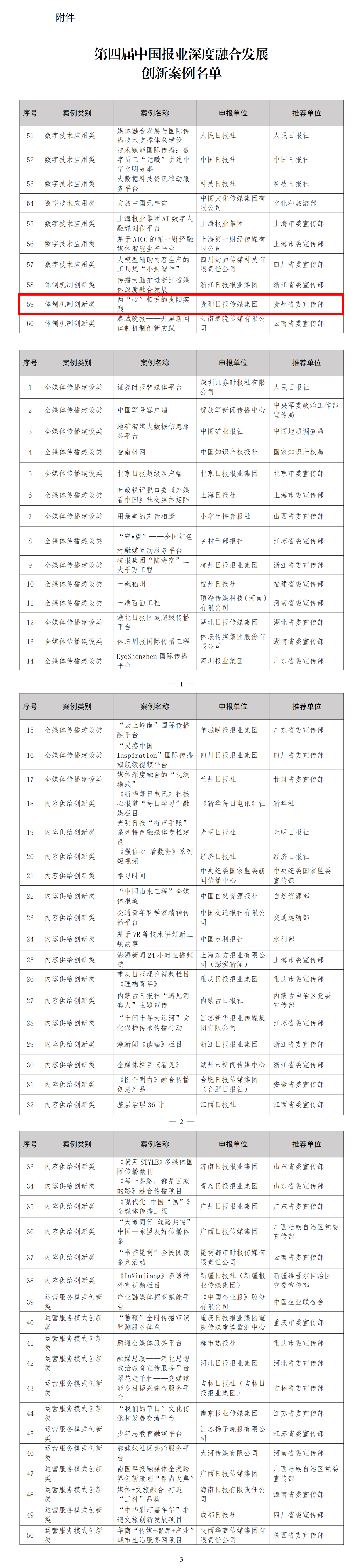 2024年3月,国家新闻出版署印发通知,组织开展第四届中国报业深度融合发展创新案例征集工作。经评审,共遴选出60个创新案例,其中,全媒体传播建设类17个,内容供给创新类21个,运营服务模式创新类12个,数字技术应用类7个,体制机制创新类3个。贵阳日报传媒集团“两‘心’相悦的贵阳实践”入选体制机制创新案例。