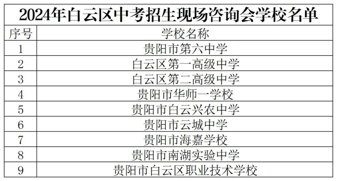 白云区教育局、白云区招生委员会以及全区公、民办普通高中学校、白云职校、贵阳六中(市属示范性高中)将现场为考生和家长提供咨询服务。