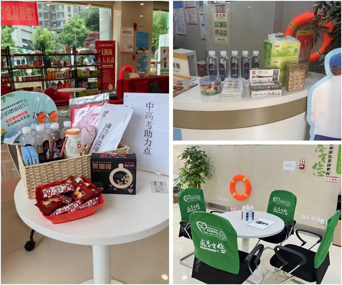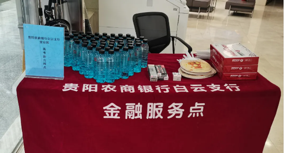 白云支行分会在支行营业部、金阳支行设置高考爱心驿站,为高考学子无偿提供水性笔、笔芯、橡皮擦等文具用品,贴心为考生及陪考家长准备矿泉水,并为其提供临时休息场所及绿色窗口,用实际行动助力高考。