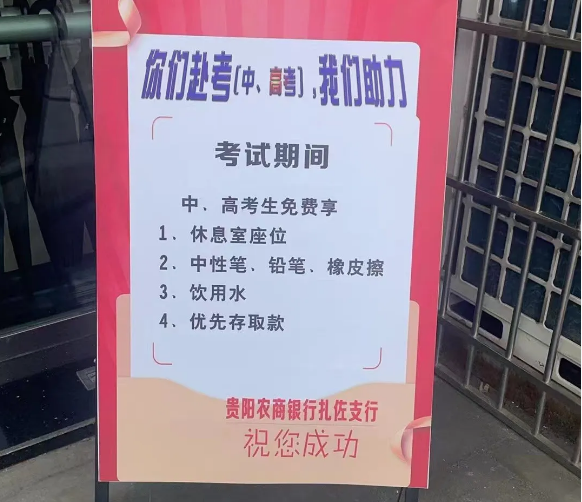 云岩支行分会辖内营业部、未来方舟支行、梦想典城支行、中山南路支行、宝山北路支行、飞山街支行、八鸽岩支行将户外劳动者服务站设立为“中高考助力点”。网点门口放置有助考讯息的荧光板,设置爱心柜台、爱心专区等,为考生与家长免费提供复印打印、乘凉休憩、饮水、雨衣雨具等服务,为考生们加油鼓劲。
