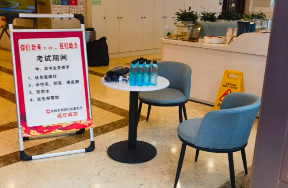 修文支行分会在网点设立“考试加油站”,为考生及家长提供矿泉水、文具、应急药品等。考试期间为考生免费提供休息室,免费领取中性笔、铅笔、橡皮擦,饮用水等,并为考生及家长优先办理存取款业务。