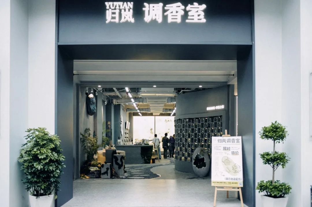 走进新印1950归岚调香室,白色主色调的闻香墙上,错落有致地放置了上百款香水精油,供客人们根据偏好进行闻香选择。门口的展示柜上,家居香氛、车载香氛,衣物喷雾等定制产品吸引着路人驻足。