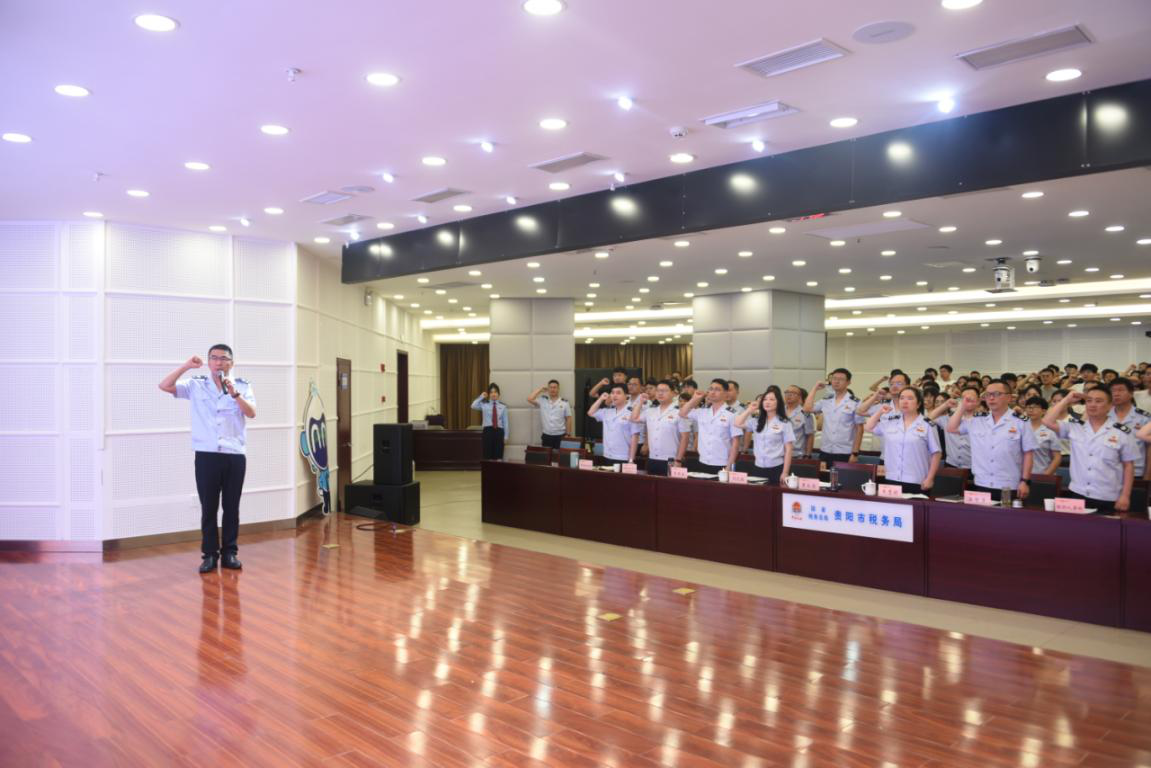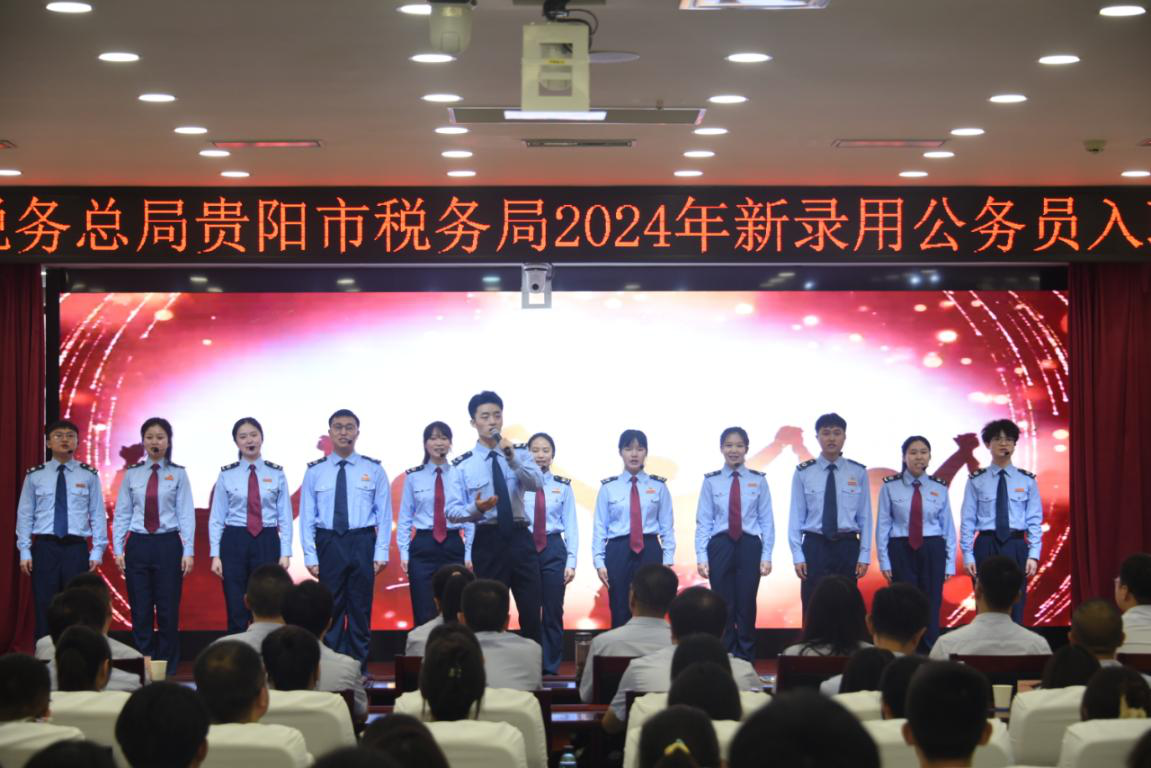 仪式在贵阳市税务局形象宣传片中拉开序幕,105名贵阳税务系统新录用公务员在贵阳市税务局党委书记、局长李永忠的带领下进行宪法宣誓,“我宣誓:忠于中华人民共和国宪法,维护宪法权威,履行法定职责……”大家右手握拳,庄严宣誓,在心中铭刻下税务生涯的忠诚担当。紧接着,双龙航空港经济区税务局的税务人员带来歌曲《入海》,歌声悠扬,旋律动人,不仅展现了贵阳税务人员多才多艺的一面,也寓意着新人们将如同汇入大海的涓涓细流,在税务事业的广阔天地中勇往直前,不断壮大。